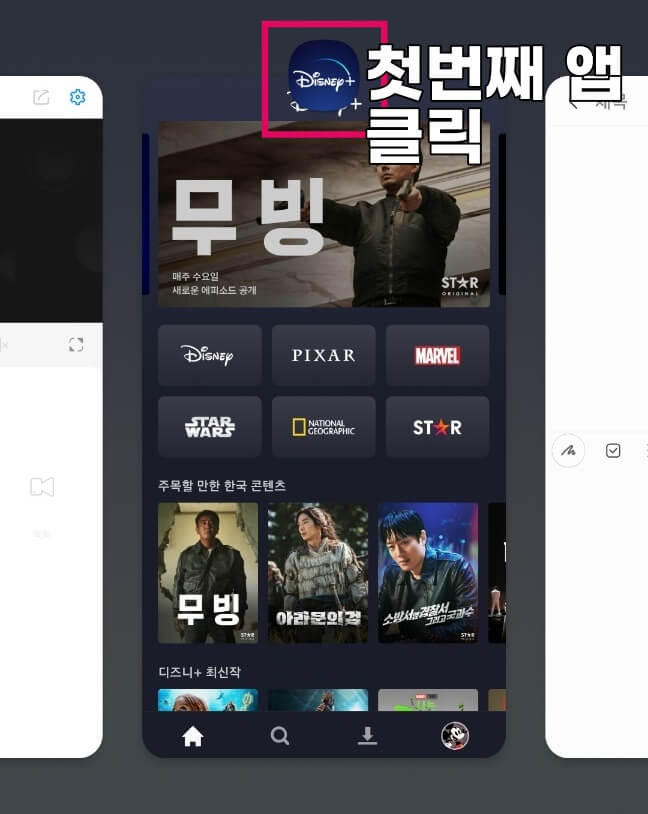 스마트 폰을 사용하다 보면 동시에 두 가지 작업을 하고 싶을 때가 있는데요. 뭔가를 보면서 계산이 필요할 때 계산기 앱을 켠다던지 영상을 보면서 문자나 카톡을 할 때 그런 기능이 필요하더라고요. 물론 팝업기능이 있긴 하지만 화면 분할이 크기 조정도 돼서 더 편한 것 같아요. 특히 디즈니플러스처럼 팝업 기능이 없는 앱은 화면 분할 기능이 더 요긴하게 사용되는 것 같아요.