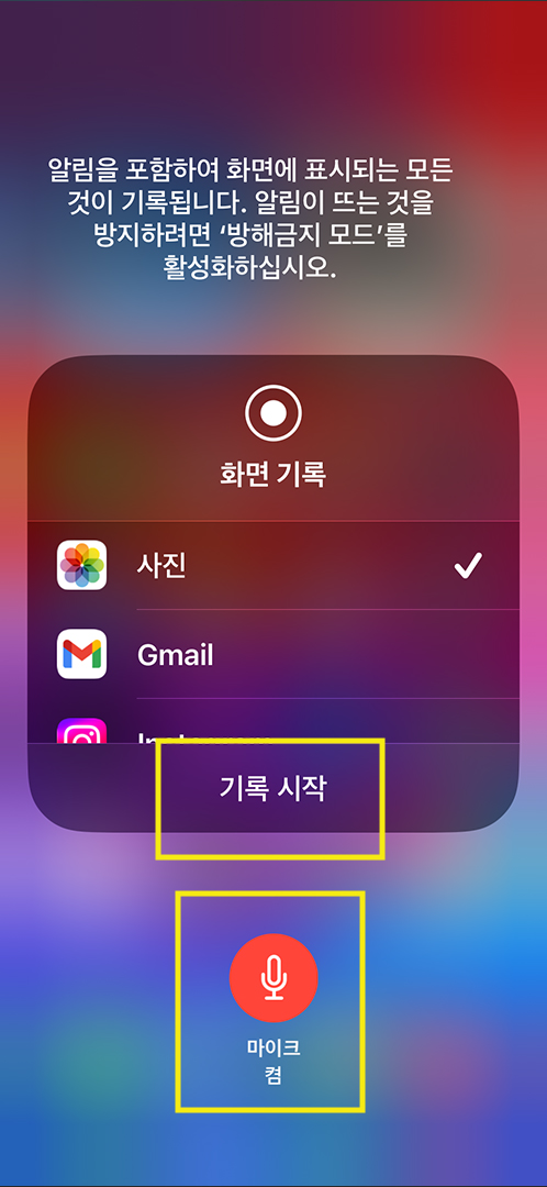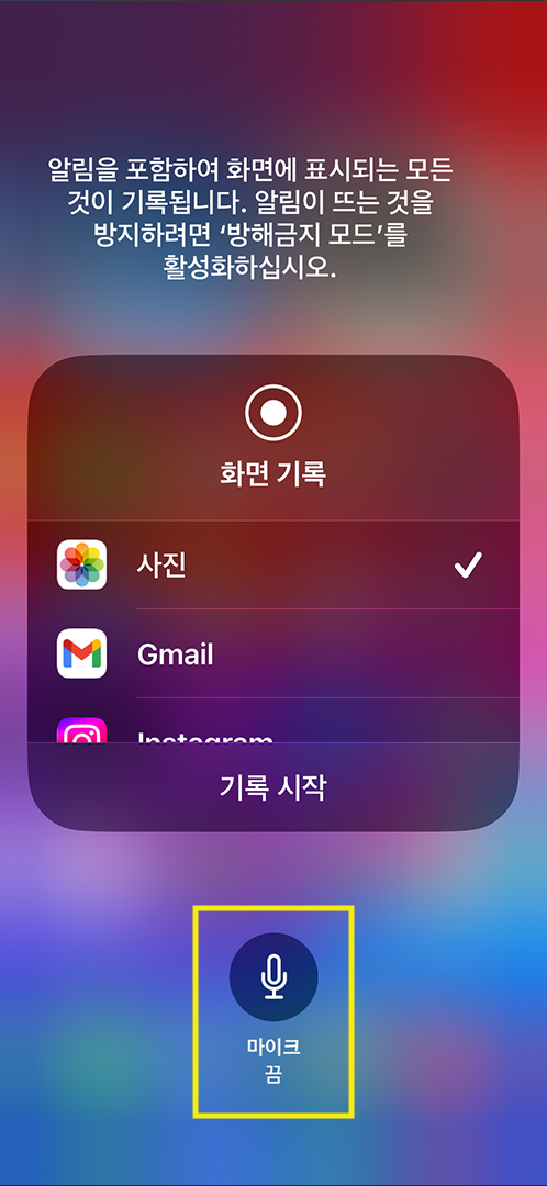 화면 녹화를 시작하기 전에 아이콘을 길게 누르면 마이크 모양의 아이콘이 나옵니다.