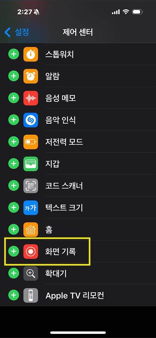 아래로 메뉴들을 내려보면 '화면기록'이라는 글씨가 보일텐데 그 옆에 +버튼을 눌러주기만 하면 됩니다.