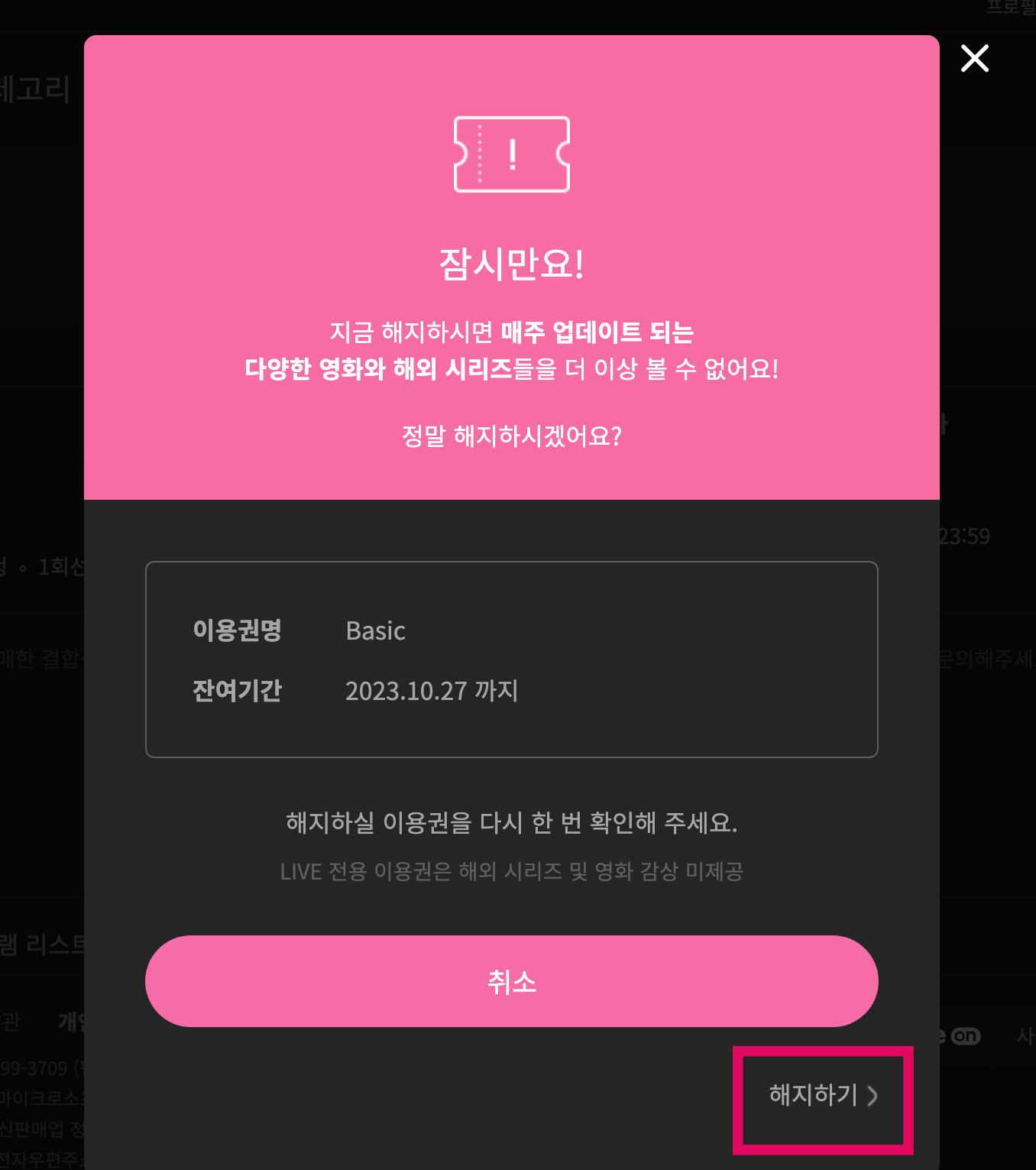 그다음 '자동결제 해지 ➞ 해지하기' 버튼을 클릭합니다.