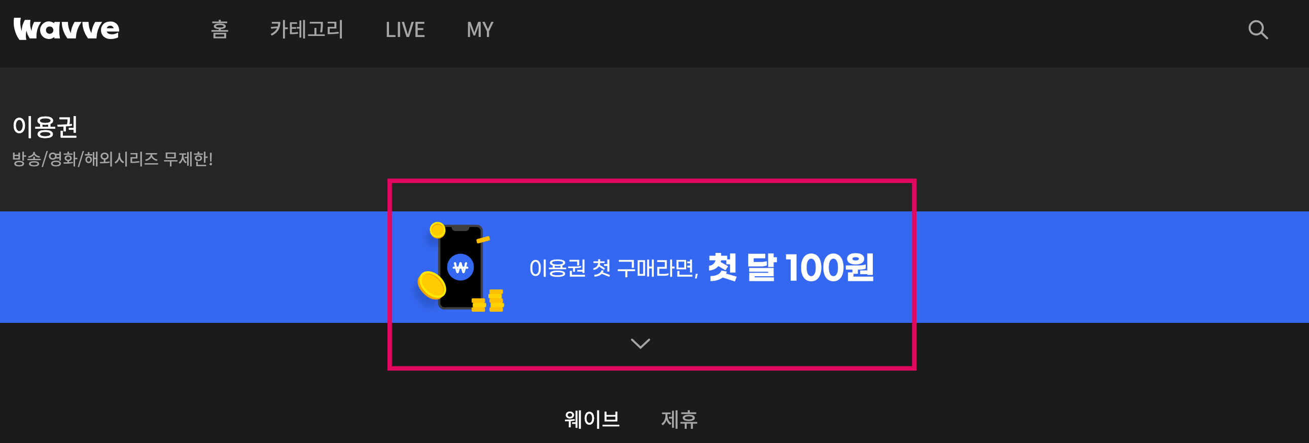 연휴 기간 동안 뭘 할까 생각하다가 그동안 못 봤던 드라마도 볼 겸 웨이브를 이용하려고 했는데요. 전에는 잘 몰라서 앱으로 접속해서 결제를 해서 할인을 받지 못했거든요. 그래서 이번에는 PC로 접속해서 한 달 100원 이용에 성공했습니다. 웨이브 한 달 100원 이용을 하려면 꼭 PC나 모바일 웹을 통해서 접속을 해야만 합니다. 구글 플레이나 웨이브 앱을 통해서는 할인 적용이 안되더라고요.