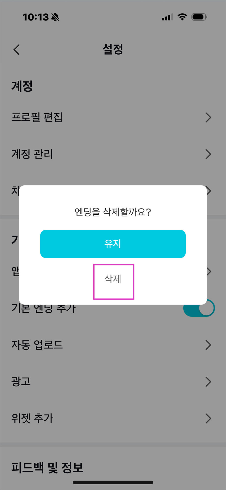 그 부분을 꺼주시면 되는데 그러면 아래 화면처럼 '엔딩을 삭제할까요'란 메시지가 나와요.