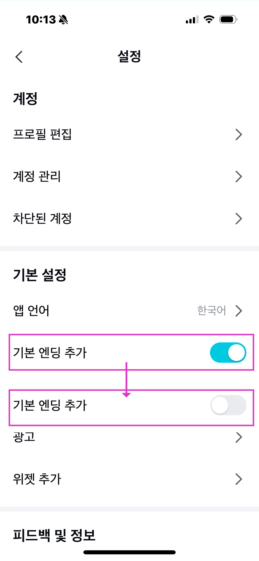 그러면 기본 설정에서 기본 엔딩 추가 항목이 켜져 있을 거예요.